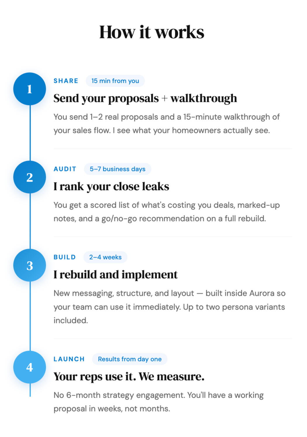 I need to see what your homeowners actually see — not a sanitized sample. I also want to know what your reps say when they present it, where objections come up, and where deals stall.Step 2: I audit the full buyer experience and rank the close leaks.